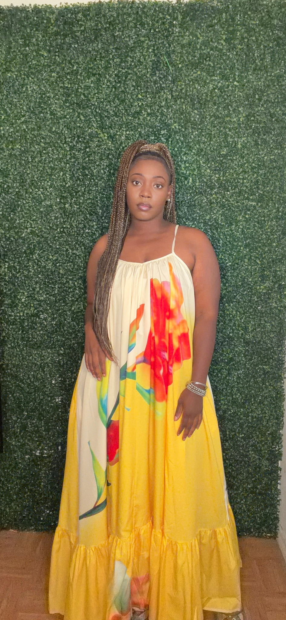 Sunshine Flower Dress This sleeveless dress features a striking oversized floral design on the front, bringing vibrant color and botanical elegance to your wardrobe. The one-size fit ensures effortless styling for various body types, while practical pockets add functionality without compromising the dress's polished aesthetic. Perfect for warm-weather occasions, this piece transitions seamlessly from casual daytime wear to evening gatherings with minimal accessorizing required.